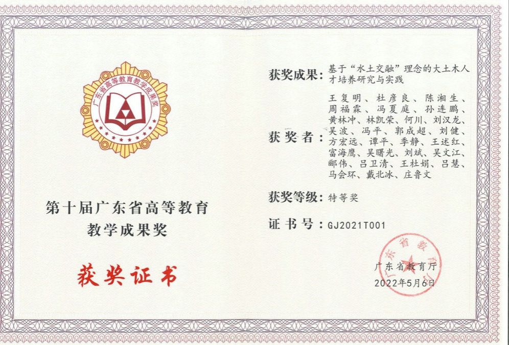近年來,學(xué)院有5位學(xué)生應(yīng)征入伍,其中1人榮立三等功;有4位同學(xué)榮獲粵港澳大灣區(qū)高校土木工程專業(yè)優(yōu)秀本科畢業(yè)生獎(jiǎng);有14位畢業(yè)生赴基層就業(yè),畢業(yè)生深受用人單位的歡迎和好評(píng)。2022年,學(xué)院本科畢業(yè)生有24人進(jìn)入世界排名前50的高校繼續(xù)深造。王復(fù)明院士領(lǐng)銜主持的《基于“水土交融”理念的大土木人才培養(yǎng)與實(shí)踐》獲廣東省教育教學(xué)成果特等獎(jiǎng)。