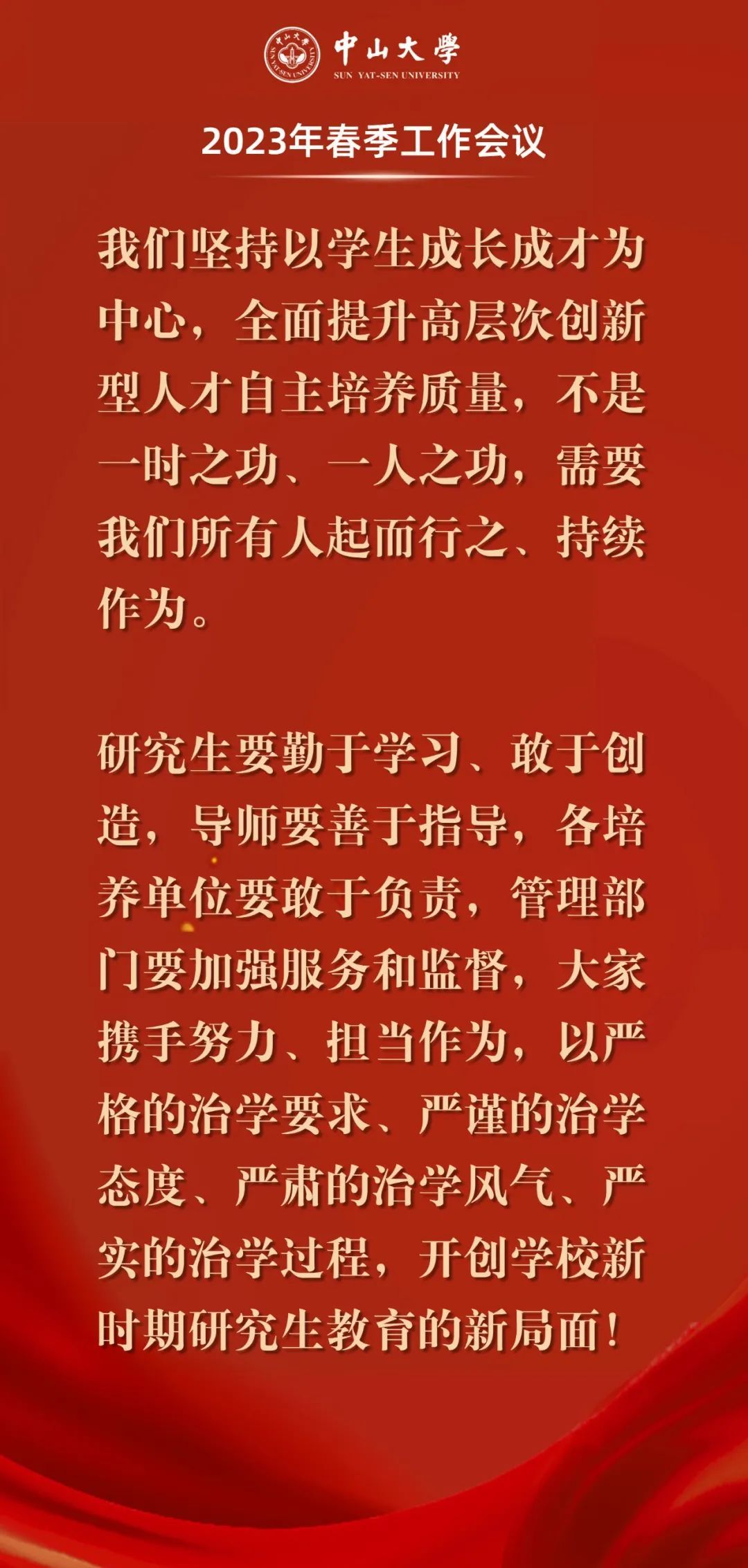 中大新聞網(wǎng)廣州4月9日電(記者邱清萌、孫?。?月8日下午,中山大學(xué)2023年春季工作會(huì)議在珠海校區(qū)拉開(kāi)帷幕。本次大會(huì)主題聚焦“研究生培養(yǎng)”,校長(zhǎng)高松院士作題為“以學(xué)生成長(zhǎng)成才為中心,全面提升高層次創(chuàng)新型人才自主培養(yǎng)質(zhì)量”的大會(huì)報(bào)告,回顧了過(guò)去幾年中山大學(xué)研究生教育的發(fā)展和成績(jī),探討了新時(shí)期培養(yǎng)引領(lǐng)未來(lái)的復(fù)合型高層次創(chuàng)新人才的思路和舉措,為推動(dòng)研究生教育改革創(chuàng)新、穩(wěn)步扎實(shí)推進(jìn)學(xué)校高質(zhì)量?jī)?nèi)涵式發(fā)展明確了發(fā)展目標(biāo)和工作路徑。