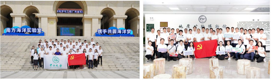 參觀合影(左圖在海琴四號樓前,右圖在地質(zhì)礦物博物館中)