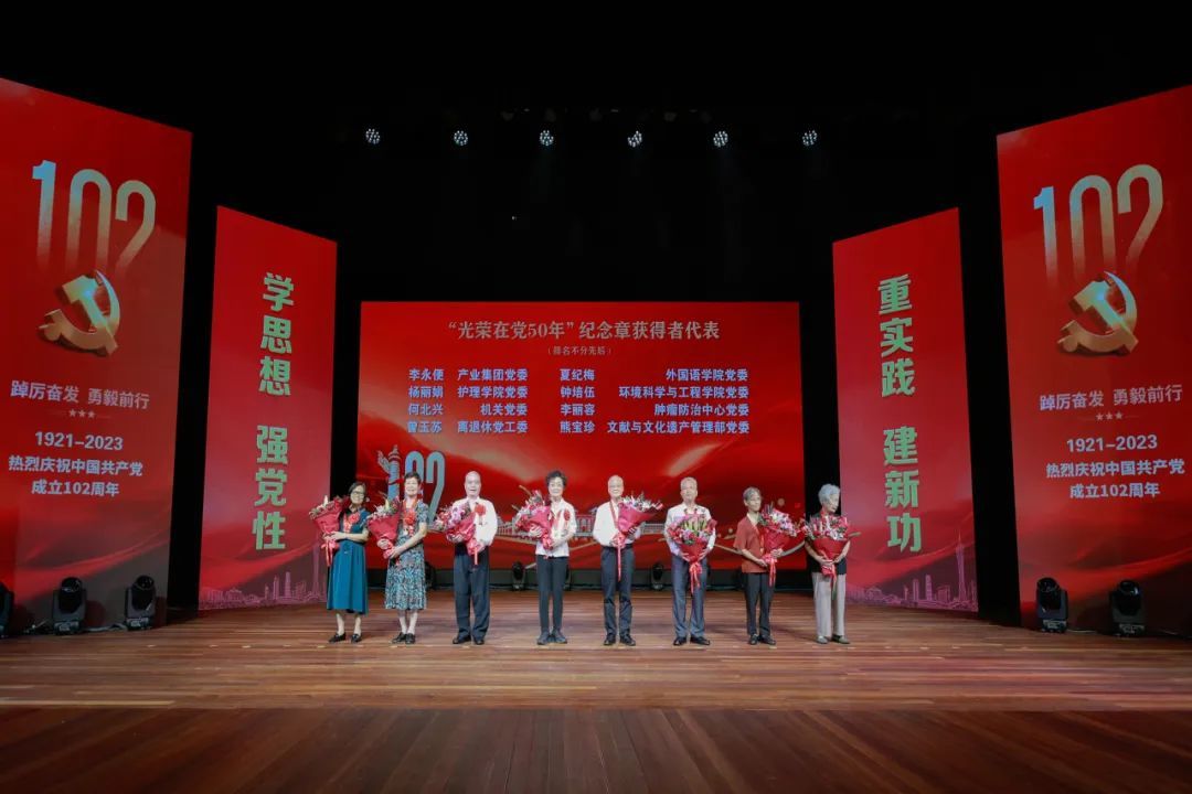 李永便、楊麗娟、何北興、曾玉蘇、夏紀(jì)梅、鐘培伍、李麗容、熊寶珍8位獲得“光榮在黨50年”紀(jì)念章的黨員同志來到現(xiàn)場(chǎng),與會(huì)人員用掌聲和鮮花向老黨員代表致以崇高的敬意。