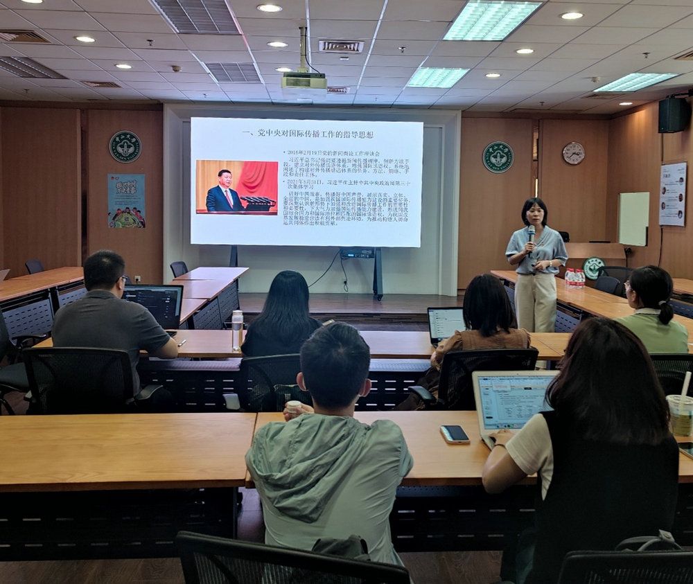 6月20日,學院黨委委員、院長鐘智錦教授結合黨中央對國際傳播工作的要求,為大數(shù)據(jù)傳播研究生黨支部講授了題為《創(chuàng)新國際傳播思維,有效傳播中國聲音》的黨課。她細致分析了當前中國國際傳播面臨的困難與挑戰(zhàn),就“大數(shù)據(jù)和人工智能如何助力國際傳播能力提升”這一問題提出了監(jiān)測輿論動態(tài)、語言識別與翻譯等多個切實可行的建議,為支部同學未來的工作方向提供了指導。