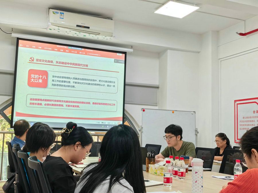 7月12日,財務(wù)處黨總支第二黨支部宣傳委員胡陽以《堅定文化自信,擔當文化使命,建設(shè)中華民族現(xiàn)代文明》為題講黨課,以學習黨的創(chuàng)新理論為主線,充分發(fā)揮黨員干部理論學習帶頭示范效應(yīng),在學懂弄通做實上走在前、作表率,帶動支部全體黨員常學常新。