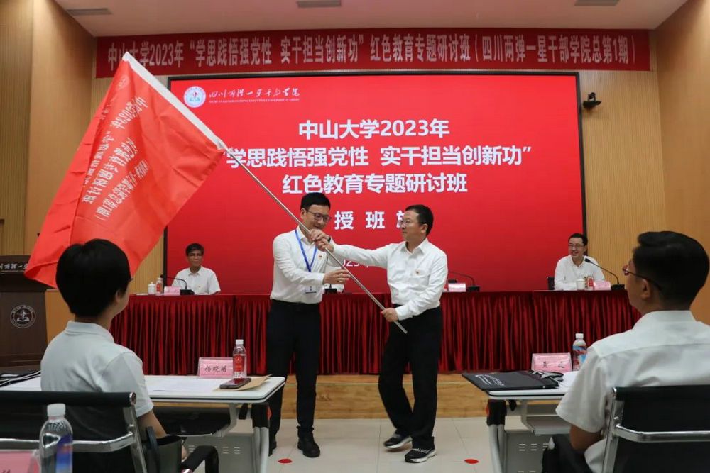 隨后,高松校長為此次培訓班授班旗,培訓班班長、中山大學附屬第一醫(yī)院副院長張弩代表班級接受班旗并鄭重表態(tài),將以端正的學習態(tài)度、嚴明的紀律要求、積極的好學之心,帶著問題、帶著思考、帶著責任認真學,真正做到學有所思、學有所悟、學有所獲。