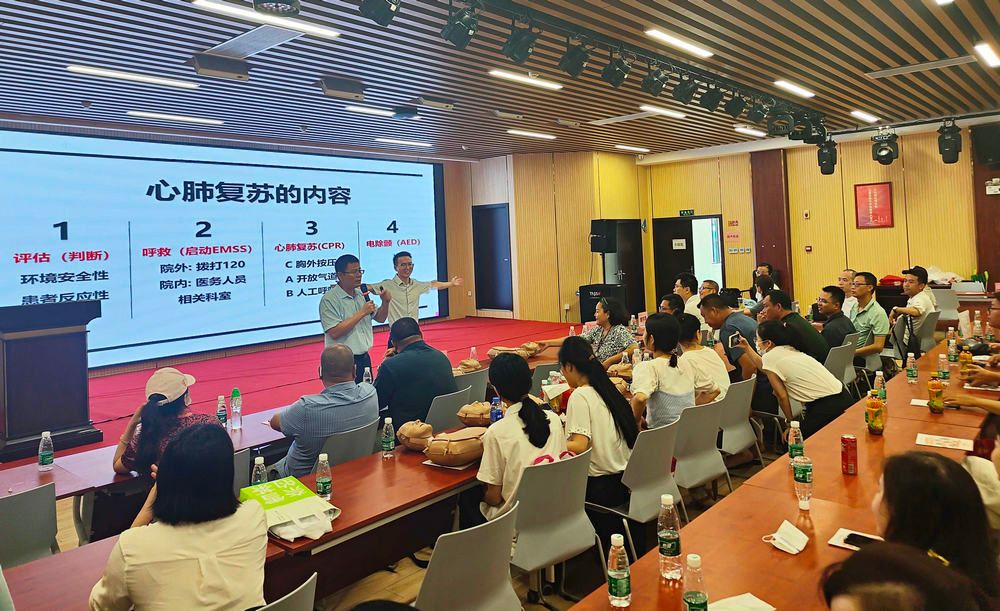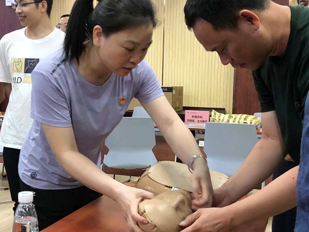 行政教職工第二黨支部黨員講解正確的心肺復(fù)蘇術(shù)、海姆立克手法和自動(dòng)體外除顫儀(AED)急救儀器使用方法