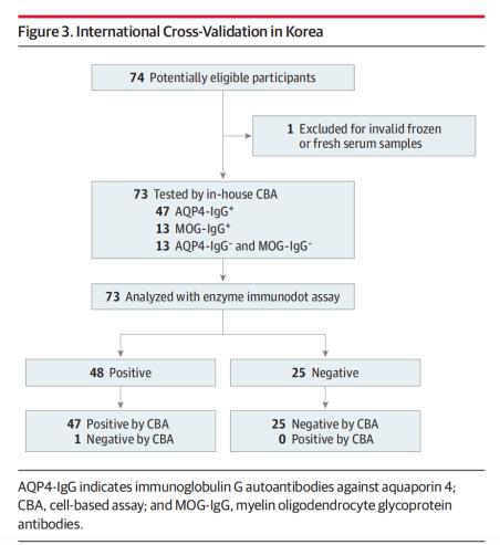 中大新聞網(wǎng)訊(通訊員孫曉渤)9月5日,國際神經(jīng)病學頂級期刊JAMA Neurology 在線發(fā)表了國際創(chuàng)新技術(shù)-免疫斑點法(IDoT)檢測水通道蛋白(AQP4)抗體的研究論著。這是目前國內(nèi)神經(jīng)免疫抗體檢測研究成果首次發(fā)表于該期刊,在國際神經(jīng)免疫病研究領(lǐng)域發(fā)出了中國聲音,也體現(xiàn)了國際同行對中國開展國際臨床合作研究的認可。邱偉(中山大學附屬第三醫(yī)院,末位通訊)、Ho Jin Kim(韓國國立癌癥中心)為共同通訊作者;付瑩(福建醫(yī)科大學附屬第一醫(yī)院)、畢錦(福建醫(yī)科大學附屬第一醫(yī)院)、閆亞平(陜西師范大學)、孫曉渤(中山大學附屬第三醫(yī)院)為共同第一作者。該研究得到了天津醫(yī)大總醫(yī)院施福東、廣醫(yī)二院龍友明、中山大學附屬第三醫(yī)院李銳等專家的指導。