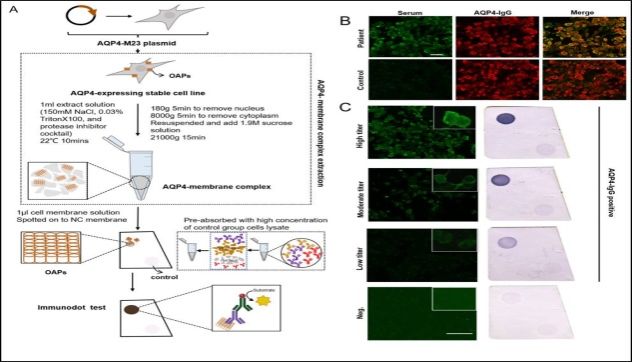 視神經(jīng)脊髓炎視譜疾病(NMOSD)是神經(jīng)免疫病的一種,亞洲女性多發(fā)。NMOSD會反復發(fā)作視神經(jīng)炎和脊髓炎,最終造成神經(jīng)功能障礙,給家庭、社會造成負擔。目前,NMOSD診斷依賴外周血水通道蛋白4(AQP4-IgG)抗體檢測,因此,基于細胞表達的抗體檢測方法(CBA)于2015年被國際NMOSD診斷指南推薦,作為當今AQP4-IgG抗體檢測的金標準。然而,CBA法耗時3-7天,且需要特殊實驗室和技術(shù)人員等,大大限制了CBA法的廣泛使用,尤其在一些NMOSD高發(fā)、但醫(yī)療條件欠發(fā)達的地域;并且,目前商品化的檢測試劑盒仍依賴國外進口,檢測成本極高。