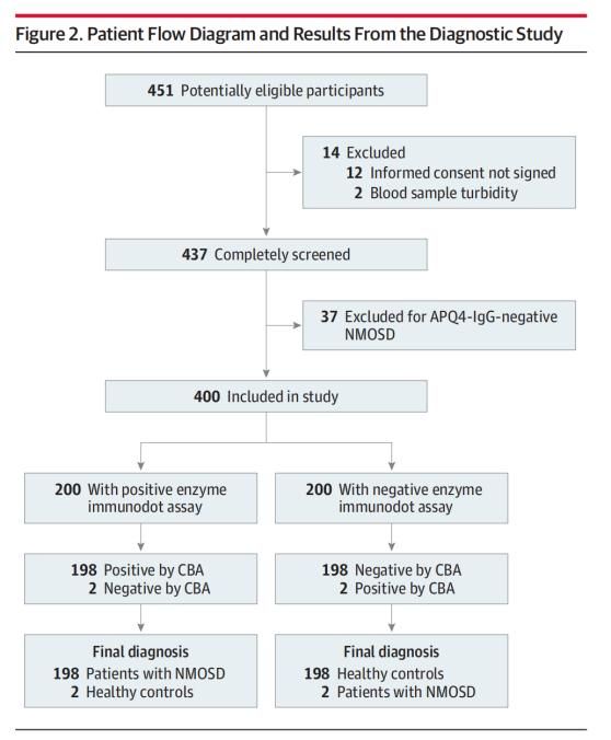 該研究在中國(廣東、福建)和韓國共檢測836例患者的血清樣本。結(jié)果顯示,與傳統(tǒng)的金標準CBA法對比(活細胞CBA法或者固定CBA法等),IDoT法的抗體檢測性能與CBA相當,診斷性研究結(jié)果Kappa系數(shù)為98.0%(400例患者);436例驗證者,包括275例其他疾病隊列(風濕免疫疾病等)、57例NMOSD前瞻性隨訪隊列、31例國內(nèi)交叉驗證隊列、73例韓國神經(jīng)免疫疾病隊列交叉驗證(NMOSD、MOGAD等),整體驗證隊列結(jié)果中,僅2例與CBA檢測不一致。因此,IDoT總體敏感性為99.4% (95%CI: 97.8% - 99.9%), 特異性為99.2%(95%CI: 98.0% - 99.8%)。