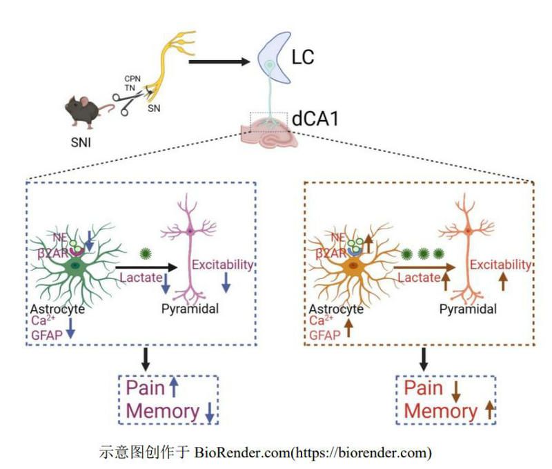 此研究利用坐骨神經(jīng)分支選擇性損傷模型(SNI)小鼠,發(fā)現(xiàn)10天后即出現(xiàn)共病,同時(shí), 背側(cè)海馬CA1星形膠質(zhì)細(xì)胞鈣信號(hào)對(duì)機(jī)械痛刺激的反應(yīng)明顯減弱、星形膠質(zhì)細(xì)胞GFAP表達(dá)量以及分支明顯減少,乳酸含量明顯降低,離體全細(xì)胞膜片鉗發(fā)現(xiàn)錐體神經(jīng)元內(nèi)在興奮性明顯下降。而在 SNI 鼠 CA1區(qū)外源性補(bǔ)充乳酸能夠提高機(jī)械痛閾、引起條件位置性偏愛、提高新奇事物認(rèn)知能力并提高錐體神經(jīng)元的興奮性。相反,在正常動(dòng)物用糖原磷酸化酶抑制劑抑制 CA1 乳酸合成或通過抑制單羧酸轉(zhuǎn)運(yùn)體阻斷乳酸轉(zhuǎn)運(yùn)到錐體神經(jīng)元,均引起正常動(dòng)物痛覺過敏和記憶障礙?;瘜W(xué)遺傳學(xué)特異性激活藍(lán)斑(LC)到背側(cè)海馬CA1 去甲腎上腺素能投射能緩解共病。同時(shí),化學(xué)遺傳學(xué)激活 LC 去甲腎上腺素能神經(jīng)元可以提高共病鼠dCA1 星形膠質(zhì)細(xì)胞鈣信號(hào),并增加乳酸釋放。這一研究發(fā)現(xiàn)了外周神經(jīng)損傷小鼠CA1星形膠質(zhì)細(xì)胞異常導(dǎo)致乳酸釋放減少,進(jìn)而引起錐體神經(jīng)元興奮性下降,最終使小鼠出現(xiàn)共病,而激活LC去甲腎上腺素能神經(jīng)元?jiǎng)t能夠緩解上述表現(xiàn)。證實(shí)了外周神經(jīng)損傷后LC去甲腎上腺素能神經(jīng)元未能充分驅(qū)動(dòng)dCA1星形膠質(zhì)細(xì)胞的乳酸釋放功能來支持錐體神經(jīng)元的興奮性,導(dǎo)致共病。這為治療神經(jīng)病理性疼痛和記憶障礙共病提供了潛在靶點(diǎn),以及提供了新的研究通路方向。