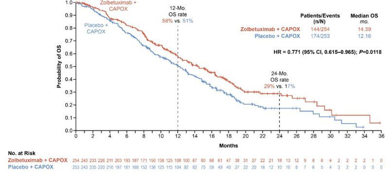 在關(guān)鍵次要終點方面,Zolbetuximab與CAPOX聯(lián)合用藥顯著延長了OS,治療組和安慰劑組的中位總生存期分別為14.39個月(95%CI:12.29-16.49)和12.16個月(95%CI:10.28-13.67),死亡風險降低了22.9%(HR=0.771;P=0.0118)。此外,在CAPOX基礎(chǔ)上加入Zolbetuximab進行治療,未增加嚴重不良反應(yīng)發(fā)生率(治療組和安慰劑組分別為47.2%、49.8%)