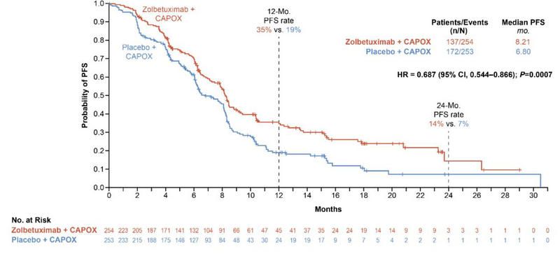 GLOW研究結(jié)果顯示,與安慰劑+CAPOX組相比,Zolbetuximab+CAPOX組的PFS顯著提升,治療組和安慰劑組的中位PFS分別為8.21個月(95%CI:7.46–8.84)和6.80個月(95%CI:6.14–8.08),疾病進展或死亡風險降低了31.3%(HR=0.687;P=0.0007),達到了主要終點。