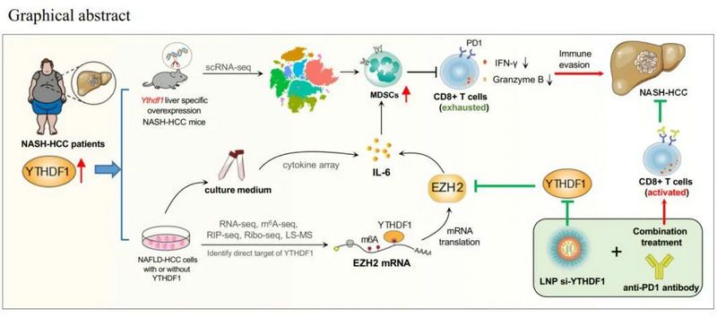 該研究首次發(fā)現(xiàn)YTHDF1-EZH2-IL-6信號軸可以招募和激活MDSCs,導(dǎo)致細(xì)胞毒性CD8+T細(xì)胞功能障礙,從而促進(jìn)NASH-HCC的發(fā)生和發(fā)展。靶向YTHDF1可以提高NASH-HCC抗anti-PD1免疫治療應(yīng)答新靶點(diǎn)。