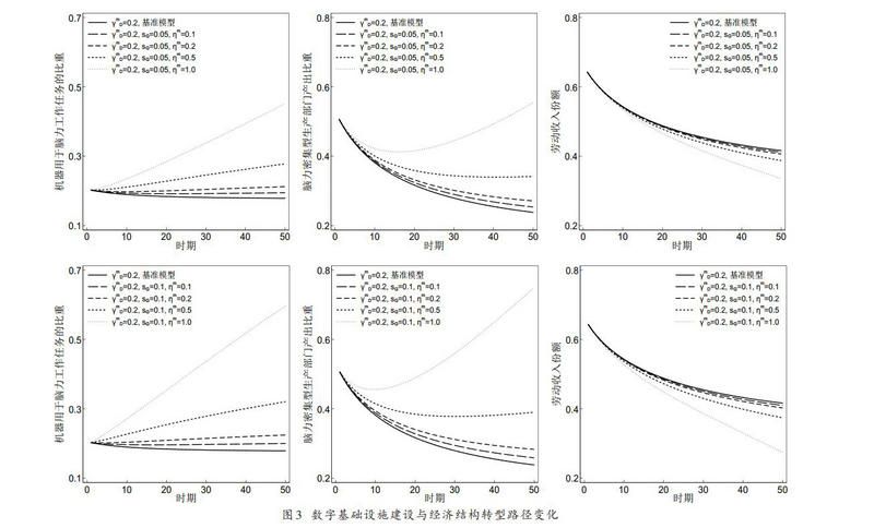 第二,在機(jī)器和人的替代彈性還不高,機(jī)器的腦力工作偏向型技術(shù)還不成熟時(shí),勞動(dòng)供給轉(zhuǎn)變和機(jī)器應(yīng)用并不會(huì)加速人工智能變革,此時(shí)政府加強(qiáng)數(shù)字基礎(chǔ)設(shè)施建設(shè)可以更大幅度提高腦力工作任務(wù)中機(jī)器擴(kuò)展型技術(shù),從而促使經(jīng)濟(jì)進(jìn)入機(jī)器應(yīng)用和勞動(dòng)供給轉(zhuǎn)變推動(dòng)人工智能變革的內(nèi)生動(dòng)態(tài)路徑,實(shí)現(xiàn)經(jīng)濟(jì)結(jié)構(gòu)轉(zhuǎn)型的路徑轉(zhuǎn)換。雖然為機(jī)器從事腦力工作任務(wù)或?yàn)槟X力勞動(dòng)密集型生產(chǎn)部門提供結(jié)構(gòu)性財(cái)政補(bǔ)貼可以加速經(jīng)濟(jì)結(jié)構(gòu)轉(zhuǎn)型,但如果無法大幅改變機(jī)器積累路徑或機(jī)器的腦力工作偏向型技術(shù)水平,就難以獨(dú)立改變結(jié)構(gòu)轉(zhuǎn)型路徑。