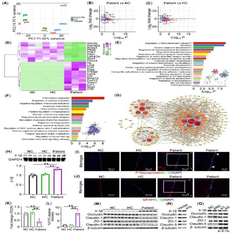 該研究進一步發(fā)現(xiàn),PBMC通過上調(diào)BBB內(nèi)皮細(xì)胞IL-1β表達(dá)以促進BBB的破壞。研究人員通過轉(zhuǎn)錄組學(xué)、免疫熒光、蛋白印跡等鑒定了PBMC通過上調(diào)IL-1β介導(dǎo)模型小鼠BBB破壞(圖3A-J),并在體外BBB模型中對內(nèi)皮細(xì)胞 Il-1β 進行敲除也發(fā)現(xiàn)敲除 Il-1β 后BBB破壞明顯減輕(圖3K-O)。