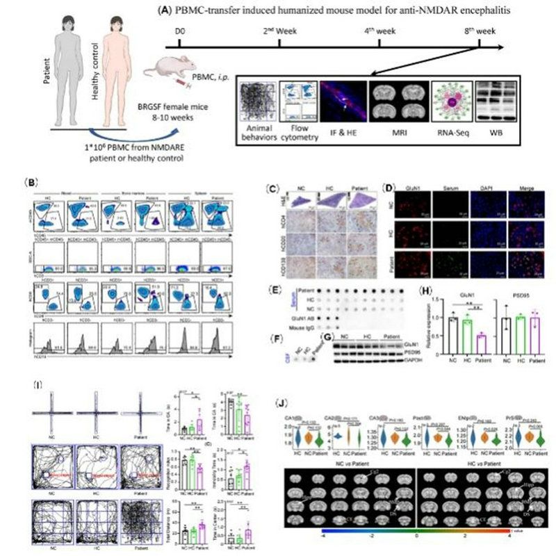 該研究首次構(gòu)建了PBMC誘導(dǎo)的人源化小鼠模型:課題組分別將抗NMDAR腦炎患者、健康受試者的PBMC(外周血單核細(xì)胞)通過腹腔注射至重度免疫缺陷小鼠-BRGSF小鼠中(圖1A),人源的免疫細(xì)胞可以在小鼠的血、脾、骨髓中存活(圖1B),小鼠脾臟形成類似于生化中心的結(jié)構(gòu)(圖1C)。而且,實驗?zāi)P托∈蟮难?、腦脊液中有抗NMDAR抗體(抗GLuN1抗體)產(chǎn)生(圖1D-F),模型小鼠腦組織中GLuN1表達(dá)下調(diào)(圖1G,H);進一步行為學(xué)檢測還發(fā)現(xiàn)模型小鼠精神行為存在異常(圖1I);通過9T功能MRI成像也顯示實驗?zāi)P托∈竽X功能紊亂和腦結(jié)構(gòu)輕度萎縮(圖1J)。
