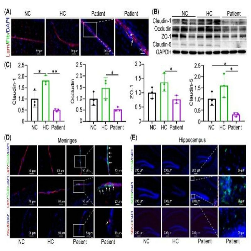該研究發(fā)現(xiàn),模型小鼠存在明顯的血腦屏障(BBB)破壞及緊密連接蛋白如Claudin-1\Occludin\ZO-1\Claudin-5蛋白下調(diào)(圖2A-C);并發(fā)現(xiàn)模型小鼠腦膜中有人B細(xì)胞、人T細(xì)胞浸潤(圖2D),且模型小鼠海馬存在CD8+T細(xì)胞浸潤(圖2E)。