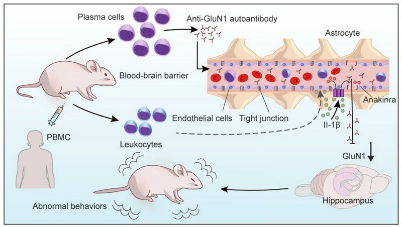 本研究首次構(gòu)建了PBMC誘導(dǎo)的人源化抗NMDAR腦炎小鼠模型,并進一步從體內(nèi)、體外實驗揭示PBMC通過上調(diào)IL-1β促進BBB的破壞進而誘導(dǎo)模型小鼠腦炎發(fā)生。該研究不僅闡明了抗NMDAR腦炎潛在的發(fā)病機制,也為抗NMDAR腦炎的精準(zhǔn)治療提供了新的靶點,并為下一步開展Anakinra藥物臨床試驗奠定了理論基礎(chǔ)。