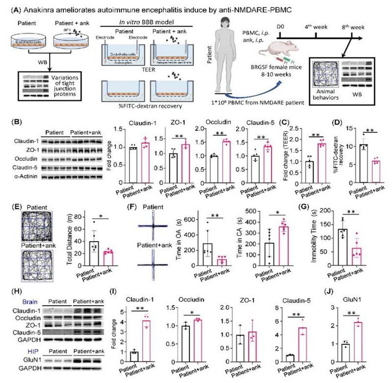 最后,該研究明確了IL-1受體拮抗劑(Anakinra, 阿那白滯素)對BBB的保護作用并可緩解模型小鼠的病情。課題組首次發(fā)現(xiàn),在體外BBB模型上,Anakinra上調(diào)緊密連接蛋白ZO-1\Occludin\Claudin-5表達(dá)(圖4B)及緩解患者PBMC對BBB模型完整性的破壞(圖4C,D);在抗NMDAR腦炎人源化模型小鼠上也發(fā)現(xiàn)Anakinra可以改善小鼠的精神行為異常(圖4E-G)、上調(diào)腦組織緊密連接蛋白以及海馬組織中GluN1的表達(dá)(圖4H-J)。