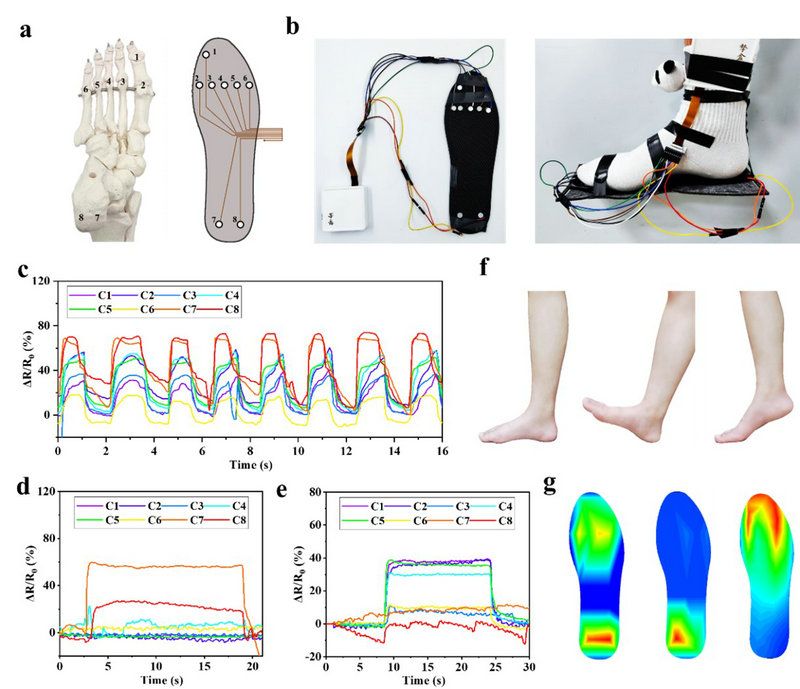 微凝膠增強(qiáng)雙網(wǎng)絡(luò)水凝膠具有較好的傳感靈敏度和出色的傳感穩(wěn)定性?;谶@一優(yōu)勢(shì),該課題組設(shè)計(jì)制造了用于監(jiān)測(cè)足底生物力學(xué)特性的陣列式傳感器。根據(jù)人體足骨骼分布,設(shè)計(jì)了一個(gè)具有八通道水凝膠傳感器陣列的可穿戴鞋墊,監(jiān)測(cè)步態(tài)過(guò)程中足底應(yīng)力分布(圖3),在健康監(jiān)測(cè)和智能醫(yī)療設(shè)備中有著良好的應(yīng)用前景。