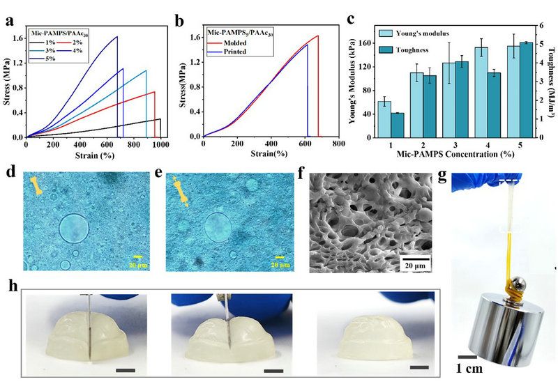 該課題組以聚(2-丙烯酰胺基-2-甲基丙磺酸)(PAMPS)微凝膠作為基本犧牲單元以耗散能量,與聚丙烯酸(AAc)第二網(wǎng)絡(luò)互穿形成微凝膠增強(qiáng)雙網(wǎng)絡(luò)水凝膠,含水量高達(dá)65%時(shí),拉伸強(qiáng)度可1.61 MPa,斷裂韌性5.08 MJ/m3。3D打印水凝膠的機(jī)械性能與模板法制備的水凝膠完全一致,經(jīng)利刃切割后仍保持結(jié)構(gòu)完整(圖2),解決了傳統(tǒng)的3D打印水凝膠傳感器機(jī)械性能差,結(jié)構(gòu)與性能不穩(wěn)定的難題。