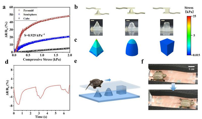3D打印的尖銳結(jié)構(gòu)在低載荷下顯著增加接觸面積并發(fā)生應(yīng)力集中,大幅提高靈敏度。如:微金字塔的壓力靈敏度比圓柱結(jié)構(gòu)提高了50倍(圖4)。利用不同微結(jié)構(gòu)傳感器的靈敏度差異,設(shè)計(jì)了空間分布的微結(jié)構(gòu)傳感器陣列,通過(guò)傳感器信號(hào)的實(shí)時(shí)變化,跟蹤、定位小烏龜?shù)呐佬熊壽E,在軟機(jī)器人及柔性可穿戴電子設(shè)備方面具有廣泛的應(yīng)用前景。