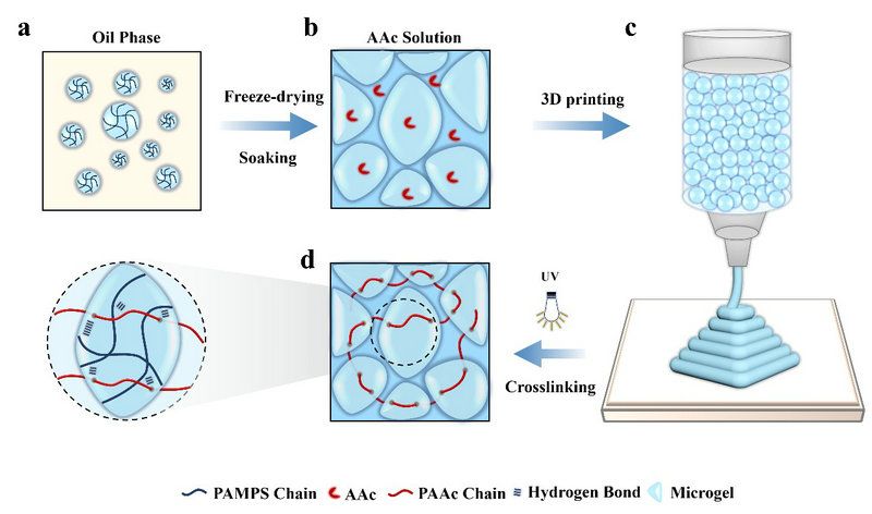 中大新聞網(wǎng)訊(通訊員付?。┧z柔性傳感器在健康和運(yùn)動(dòng)監(jiān)測(cè)方面具有廣闊的應(yīng)用前景。水凝膠傳感器靈敏度較低,是制約其發(fā)展和應(yīng)用的關(guān)鍵問(wèn)題。設(shè)計(jì)和構(gòu)筑仿生微結(jié)構(gòu)是提高柔性傳感器靈敏度、降低檢測(cè)限的重要思路。微凝膠3D打印是構(gòu)筑微結(jié)構(gòu)的有效手段,但存在結(jié)構(gòu)穩(wěn)定性較差,打印效率低等問(wèn)題。研究和開(kāi)發(fā)快速、直接打印的微凝膠墨水,提高其機(jī)械性能,是解決水凝膠3D打印技術(shù)瓶頸,推動(dòng)其在柔性可穿戴設(shè)備、組織工程等領(lǐng)域廣泛應(yīng)用的關(guān)鍵。