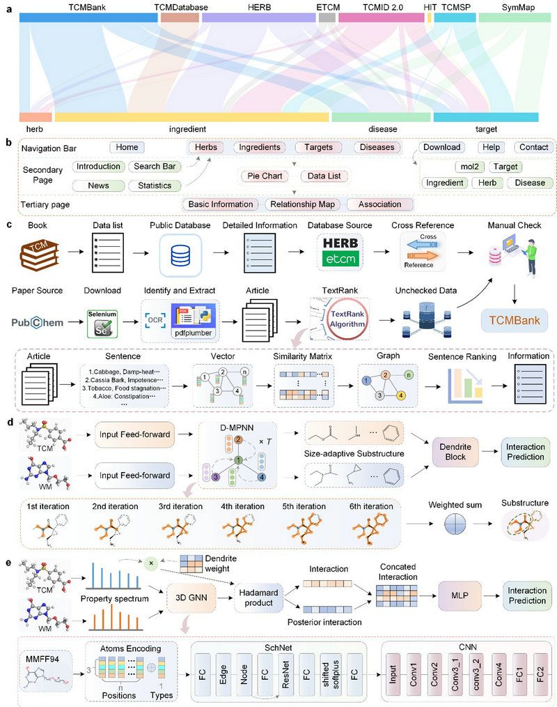 2023年,中山大學智能工程學院陳語謙教授團隊在Signal Transduction and Targeted Therapy (影響因子39.3) 期刊發(fā)表了題目為“TCMBank-the largest TCM database provides deep learning-based Chinese-Western medicine exclusion prediction”的論文。該研究建立了中醫(yī)藥數(shù)據(jù)庫TCMBank(https://TCMBank.CN/),該數(shù)據(jù)庫提供了9192種草藥,61,966種成分,15,179個靶標,32,529種疾病,及其它們之間的關(guān)聯(lián)信息。