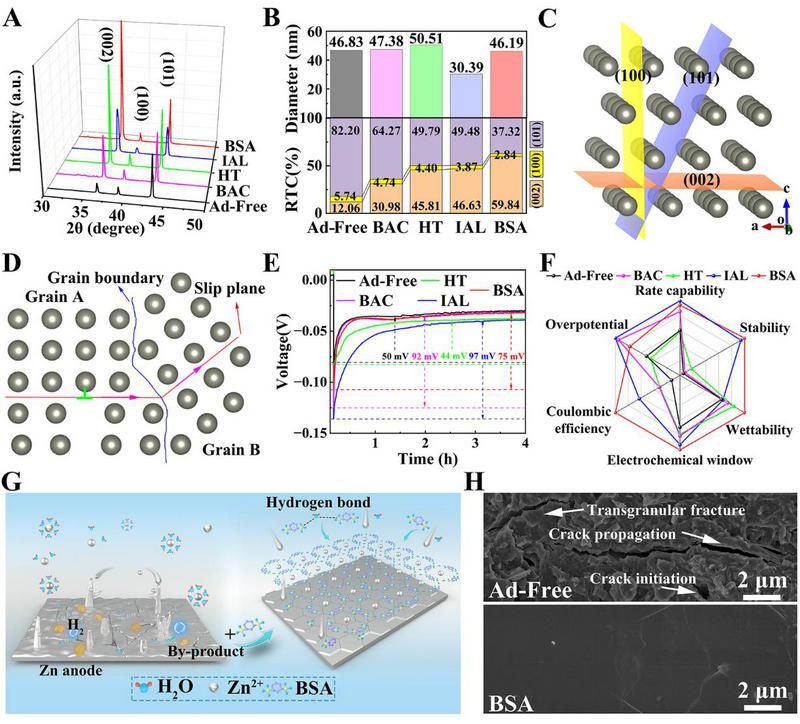 研究團(tuán)隊(duì)建立了具有不同配體的芳香有機(jī)分子數(shù)據(jù)庫,考察了23種電解液添加劑的分子結(jié)構(gòu)對“電極-電解液”界面性質(zhì)的影響,包含具有羧基、羥基、醛基和磺酸基官能團(tuán)的陰離子小分子?;诖耍ㄟ^電化學(xué)測試研究了的分子結(jié)構(gòu)、電荷狀態(tài)和螯合基團(tuán)對金屬鋅化學(xué)機(jī)械穩(wěn)定性的影響。測試結(jié)果表明,羧基和羥基配體對金屬鋅具有更強(qiáng)的化學(xué)吸附能力,引入螯合基團(tuán)有助于基于添加劑Zn2+配位的高效溶劑化。此外,醛基和磺酸基配體由于其親油性性質(zhì)促進(jìn)(002)平面的織構(gòu)生長,磺酸分子由于其大的極性表面和設(shè)計(jì)的結(jié)構(gòu)沉積物而提供了優(yōu)秀的綜合性能。添加的Zn2+復(fù)合物沉積產(chǎn)生了具有濃度梯度的保護(hù)層,從而阻礙了氧化應(yīng)力引起的裂紋擴(kuò)展。Zn//Zn穩(wěn)定性測試表明,磺酸鹽添加劑在2 mA cm-2和1 mAh cm?2下的使用壽命從50次提高到3000次。研究結(jié)果為設(shè)計(jì)與開發(fā)先進(jìn)水性儲能電解液體系開辟了新的策略。