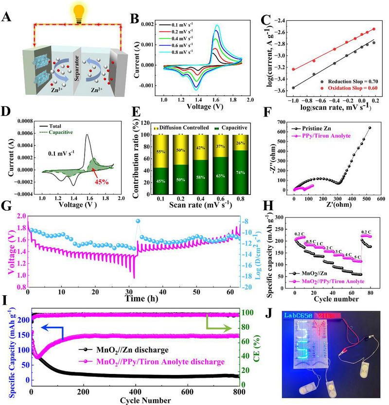 相關(guān)研究結(jié)果以“Overcoming Obstacles in Zn-ion Batteries Development: Application of Conductive Redox-active Polypyrrole/Tiron Anolyte Interphase”為題發(fā)表在Advanced Functional Materials上,中山大學(xué)材料科學(xué)與工程學(xué)院2020級碩士生羅鳴武是論文第一作者,2021級碩士生甘雄日、2021級本科生章陳然為共同作者,中山大學(xué)材料科學(xué)與工程學(xué)院為論文第一完成單位,石鎧源副教授為論文末位通訊(唯一)作者。