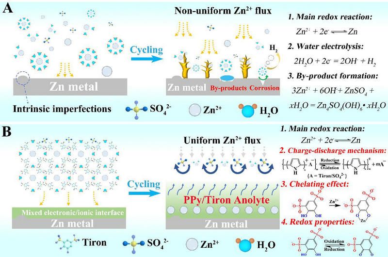 課題組提出了一種電荷轉(zhuǎn)移型人工固體電解質(zhì)保護(hù)層的制備方法,利用陽極電解液添加劑(Anolyte)的氧化還原作用提升保護(hù)界面的電化學(xué)性能。電荷轉(zhuǎn)移型固體界面由帶正電的聚吡咯和帶負(fù)電的1,2-二羥基苯 -3,5-二磺酸鈉(Tiron)所構(gòu)成,通過優(yōu)化混合導(dǎo)電界面層的結(jié)構(gòu)形貌特性用于修飾鋅負(fù)極。研究對比了化學(xué)聚合和電化學(xué)聚合法制備保護(hù)界面,分析了有/無摻雜劑和摻雜劑濃度對合成材料形貌、粒徑大小及分布的影響。結(jié)果表明,酚羥基官能團(tuán)提高了聚吡咯與基底之間的螯合作用,同時促進(jìn)了電解液的氧化還原反應(yīng)。 此外,引入磺酸根能夠重塑硫酸鋅中[Zn(H2O)6]2+的溶劑化殼結(jié)構(gòu),減弱水分子的電化學(xué)活性。在“充電-放電” 過程中,電荷轉(zhuǎn)移型固體界面通過聚吡咯的摻雜/去摻雜行為促進(jìn) 了Tiron 在電極表面的吸附/解吸,外加電場導(dǎo)致了“Zn2+-Tiron”絡(luò)合物的氧化,生成的中間產(chǎn)物釋放出金屬離子,利用苯酚到苯醌的相互轉(zhuǎn)化,增強(qiáng)了“電極-電解液”之間的電荷轉(zhuǎn)移。