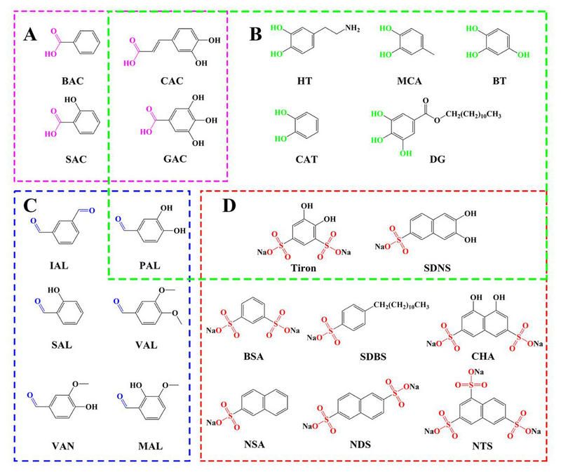 圖3 功能設(shè)計(jì)芳香分子電解液添加劑:含有(A)羧基,(B)羥基,(C)醛基和(D)磺酸基的添加劑分子結(jié)構(gòu)圖。