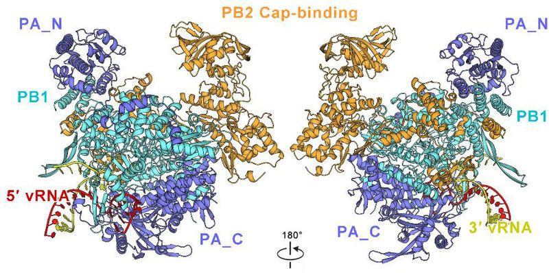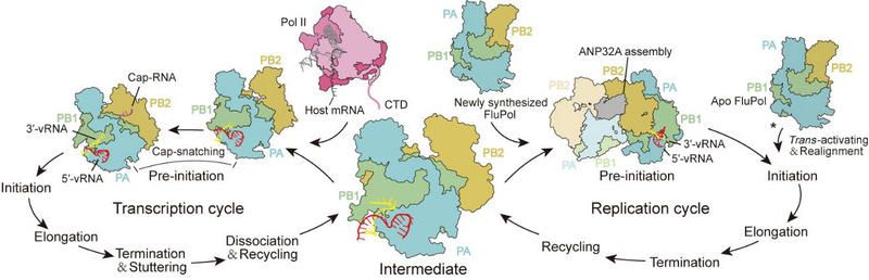 中大新聞網訊(通訊員梁歡歡、吳益喜)流感病毒 (Influenza virus)對人類健康構成了長期的重大威脅。流感病毒RNA聚合酶(以下簡稱為FluPol)是由PA、PB1和PB2三個亞基組成的異源復合物,它同時負責病毒基因組的轉錄和復制。研究表明,聚合酶在轉錄和復制功能之間的切換是至關重要的。在感染初期,FluPol主要進行轉錄過程,合成含PolyA尾的mRNA;而在感染后期,FluPol主要進行復制過程,產生子代vRNA基因組。盡管近年來多種FluPol復合體的結構被解析,FluPol如何實現轉錄和復制功能切換的機制仍不清楚。