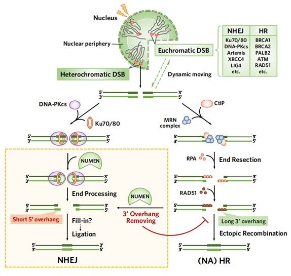 綜上所述,該研究揭示了NUMEN作為一個(gè)新發(fā)現(xiàn)的核膜錨定核酸酶,可以對(duì)DSB末端和3’overhang DNA進(jìn)行切割,產(chǎn)生有利于NHEJ修復(fù)的底物,并調(diào)控NHEJ/HR通路的選擇。NUMEN的核膜定位促進(jìn)了LADs進(jìn)行NHEJ修復(fù),有助于基因組穩(wěn)定性的維持。