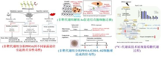 團隊提出了非靶向代謝組學(xué)可用于評價PFOA因不同暴露途徑引起的差異性毒性,發(fā)現(xiàn)相同的毒性效應(yīng)由不同的代謝途徑調(diào)控(Journal of Hazardous Materials, 2021);運用非靶向代謝組結(jié)合轉(zhuǎn)錄組學(xué)技術(shù),揭示As暴露促進(jìn)結(jié)直腸癌細(xì)胞遷移的潛在分子機制(Environment International, 2023)。此外,團隊構(gòu)建了穩(wěn)定培養(yǎng)14天的三維肝細(xì)胞球模型,運用非靶代謝組學(xué)分析PFOA暴露后三維肝細(xì)胞的代謝譜,觀察到PFOA引起三維肝細(xì)胞的代謝變化更接近人群流行病學(xué)的調(diào)查結(jié)果(Science of the Total Environment, 2022)。為了示蹤代謝通路的變化過程和評價代謝通路活性,團隊運用13C-代謝流技術(shù)研究PFOA暴露對肝細(xì)胞葡萄糖代謝的影響,發(fā)現(xiàn)PFOA是通過抑制三羧酸循環(huán)代謝,而非糖酵解,造成糖代謝紊亂(Science of the Total Environment, 2021),并且團隊以綜述論文形式詳細(xì)介紹代謝流技術(shù)和總結(jié)了代謝流技術(shù)在環(huán)境健康中應(yīng)用(Trends in Analytical Chemistry, 2023)。團隊的一系列研究工作表明,環(huán)境污染物引起機體代謝譜的變化是環(huán)境污染物毒性的一種重要特征,發(fā)現(xiàn)的活性代謝物具有減弱環(huán)境污染物毒性的能力。綜上所述,非靶向代謝組學(xué)和代謝流技術(shù)是環(huán)境健康領(lǐng)域的具有前景的重要研究手段(圖3)。