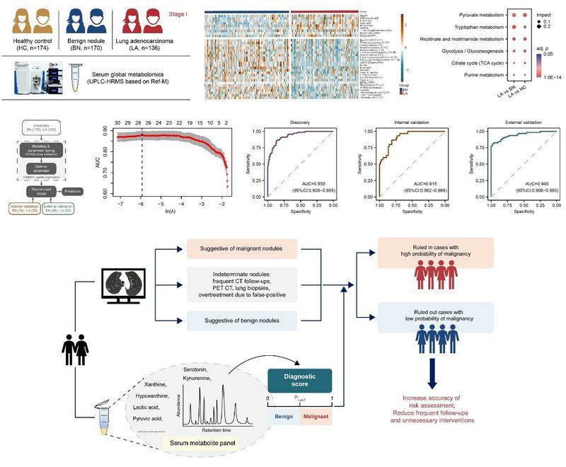 團隊進(jìn)一步與中山大學(xué)腫瘤防治中心及中山大學(xué)中山醫(yī)學(xué)院代謝平臺的黃蓬教授、胡寓旻研究員團隊合作,利用Ref-M策略找到了早期肺腺癌血清中30多種代謝標(biāo)志物,揭示了色氨酸代謝在肺腺癌糖酵解活動中發(fā)揮了重要作用。研究還直接利用Ref-M校正后的數(shù)據(jù)建立并驗證了一種血清代謝分類器,該分類器在區(qū)分LDCT掃描到的肺結(jié)節(jié)的良惡性中具有高特異性和敏感性,提高了血清代謝標(biāo)志物在CT結(jié)節(jié)風(fēng)險評估中的應(yīng)用價值,促進(jìn)了個性化診斷工具的發(fā)展。Ref-M方法靈活準(zhǔn)確,也為早期腫瘤的精準(zhǔn)診斷提供了快速可靠的分析策略(圖2)。該論文成果是中山大學(xué)腫瘤防治中心胡寓旻研究員、劉萬里主任技師以及生命科學(xué)學(xué)院欒天罡教授為論文的通訊作者,生命科學(xué)學(xué)院博士生姚瑤、中山大學(xué)腫瘤防治中心王雪萍副主任技師和中山大學(xué)附屬第一醫(yī)院關(guān)鍵副主任醫(yī)師為論文共同第一作者。研究工作也得到廣東工業(yè)大學(xué)生物醫(yī)藥學(xué)院張暉特聘研究員、中山大學(xué)中山醫(yī)學(xué)院代謝平臺俞甜甜老師等合作者的大力支持。(Nature Communications, 2023)