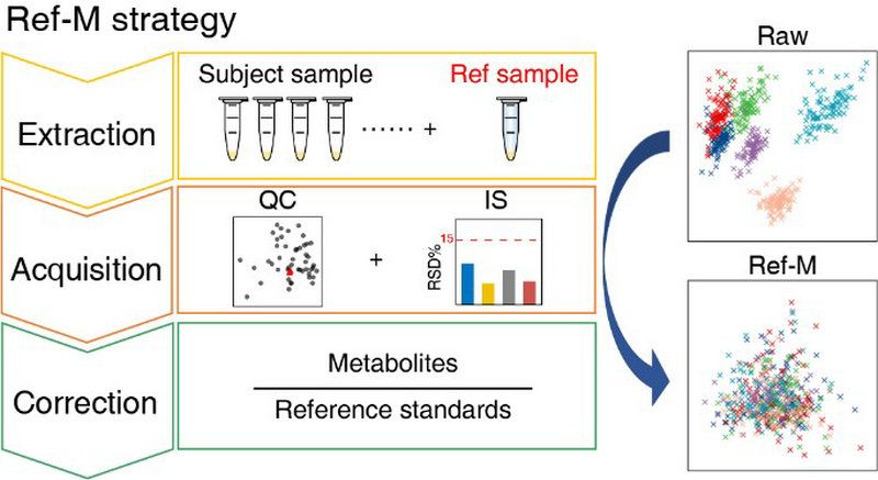 大規(guī)模代謝組學(xué)可以對生物體內(nèi)的代謝網(wǎng)絡(luò)進(jìn)行全面的研究,還可以為相關(guān)疾病的診斷和治療提供更加準(zhǔn)確的參考。然而,在大規(guī)模代謝組學(xué)研究中,多批次的樣本前處理和數(shù)據(jù)采集不可避免,這使代謝數(shù)據(jù)處理和分析也變得更加困難和復(fù)雜。因此,團隊開發(fā)了一種基于參比材料的消除代謝組學(xué)批次效應(yīng)的分析策略(Ref-M策略,圖1),Ref-M策略是一種基于參比材料建立的多批次代謝組學(xué)分析策略:將參比材料嵌入研究樣品的前處理和數(shù)據(jù)采集過程,通過同位素內(nèi)標(biāo)(IS)和質(zhì)控樣本(QC)進(jìn)行數(shù)據(jù)質(zhì)量控制,最后研究樣品中每種代謝物通過對應(yīng)參比材料中的代謝物進(jìn)行歸一化校正。該策略有效地消除了多批次代謝組學(xué)數(shù)據(jù)中不必要的批次差異,提高發(fā)現(xiàn)代謝標(biāo)志物準(zhǔn)確性。該論文成果是欒天罡教授和中山大學(xué)腫瘤防治中心胡寓旻研究員為論文的通訊作者,中山大學(xué)生命科學(xué)學(xué)院博士生姚瑤為論文的獨立第一作者。(Analytical Chemistry, 2023)
