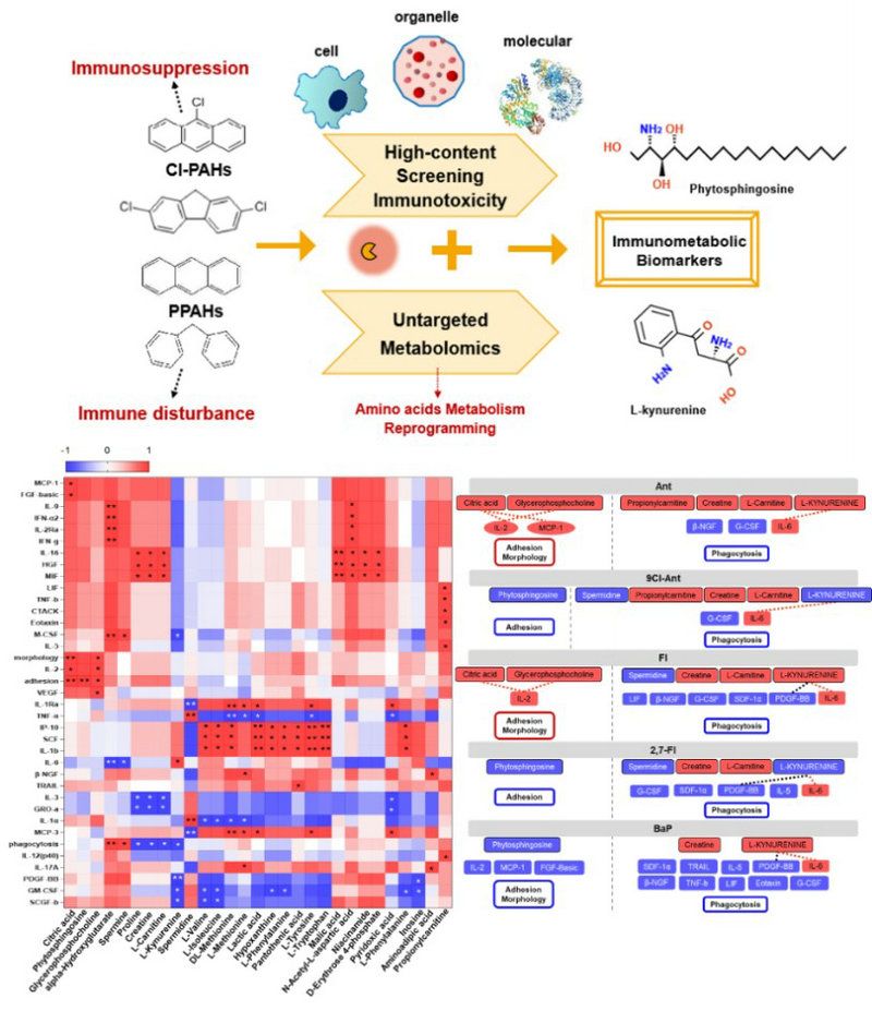 免疫系統(tǒng)作為外源污染物暴露的首道屏障和必經(jīng)之路,也是其攻擊的敏感靶標(biāo)。但免疫毒性難以甄別,損傷程度難以定量,如何高通量、精準(zhǔn)分析環(huán)境污染物的免疫毒性,一直是環(huán)境健康領(lǐng)域的重要挑戰(zhàn)。目前,環(huán)境污染物的免疫毒性檢測尚無標(biāo)準(zhǔn)方法,而傳統(tǒng)方法主要基于動物實驗,周期長、通量低、不夠靈敏,難以滿足當(dāng)前的研究需求與發(fā)展趨勢。因此,開發(fā)免疫毒性的系統(tǒng)篩查與準(zhǔn)確定量方法,對環(huán)境污染物的健康風(fēng)險評估具有重要意義。團隊以綜述論文的形式系統(tǒng)總結(jié)了目前免疫毒性的體外檢測技術(shù)的發(fā)展趨勢與未來展望(Trends in Analytical Chemistry, 2023)。2019年,免疫學(xué)家Medzhitov在Science中提出“免疫反應(yīng)的核心是對代謝資源(能量和中間產(chǎn)物)的靈活調(diào)配”,強調(diào)了利用代謝物精確變化解析免疫過程的可能性,這拓寬了免疫毒性的傳統(tǒng)分析模式。對此,團隊提出了“高內(nèi)涵分析—代謝組學(xué)”兩種高通量技術(shù)協(xié)同篩選環(huán)境污染物免疫毒性的全新分析策略,并以氯代多環(huán)芳烴(Cl-PAHs)這一新興的持久性有機污染物為案例成功進(jìn)行了驗證。