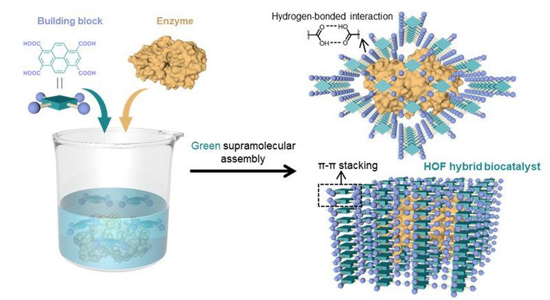 中大新聞網(wǎng)訊(通訊員黃維)天然酶是一類具有催化活性的天然聚合物,通過綠色、溫和、高效的方式催化細(xì)胞內(nèi)的生物化學(xué)反應(yīng),具有人工催化劑無法比擬的高效率。然而,酶的柔性構(gòu)象在外界刺激下極易發(fā)生變化,極大地限制了酶的大規(guī)模工業(yè)應(yīng)用。利用多孔超分子“盔甲”對天然酶結(jié)構(gòu)進(jìn)行約束、保護(hù)是設(shè)計(jì)多功能雜化生物催化劑的有效手段,既能解決酶的穩(wěn)定性問題,又能提高酶的可重復(fù)性。盡管該領(lǐng)域已取得了系列進(jìn)展,但多孔超分子框架的結(jié)晶往往需要苛刻的條件,如何實(shí)現(xiàn)在生物相容條件下原位裝配超分子晶體“盔甲”仍是技術(shù)難點(diǎn)。
