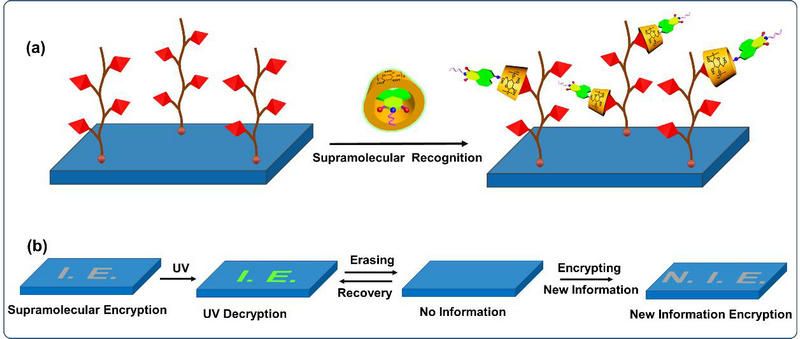 中大新聞網訊(通訊員付?。┫冗M加密技術對于信息安全、通信、商業(yè)、健康等至關重要?;诹坠?熒光效應的加密材料和技術具有便攜、易操作等優(yōu)點,得到了廣泛的研究。常用的策略將生色團均勻地分布在基底材料中,依靠離子、氧化還原、光等局部“觸發(fā)”或“淬滅”熒光效應,實現加密或解密,甚至可逆擦除-寫入,但存在非特異性解密或信息丟失等問題。將超分子作用與熒光技術結合可實現信息加密,其可逆性有利于實現重復加密-解密。研究高度選擇性和特異性加密/解密方法,實現信息可逆的寫入、擦除、重編程,提高加密水平,具有重要的意義。