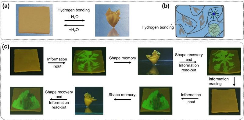 該團隊將軟物質水凝膠的形狀記憶效應(圖4a,b)與超分子作用相結合,實現了雙重加密。該水凝膠被折疊成三維結構(如玫瑰花)時,經適當脫水可固定臨時形狀,并隱藏PBG表面包含的N-CD墨水圖案或文字信息;當水凝膠吸水溶脹時,臨時形狀解除,恢復到初始的薄片形狀,其隱藏的信息在紫外線下得以解密。有趣的是,用PA溶液可以擦除雪花圖案,在已擦除的PBG表面可以涂抹新的信息,然后還可折疊成臨時形狀。這種加密、形狀記憶、恢復、擦除和重新加密周期可以重復多次。結果表明,這種超分子策略可以提高信息加密的靈活性和通用性,有利于拓寬信息加密的應用范圍。