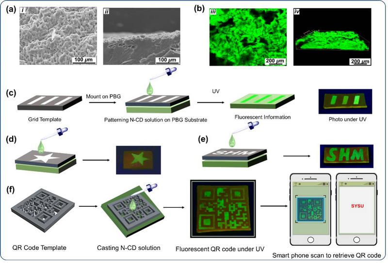 圖2(a,b)SEM和CLSM圖;(c-e)條紋、星星及字母熒光加密材料的制備;(d)二維碼的制作、信息記錄、保護及信息解讀