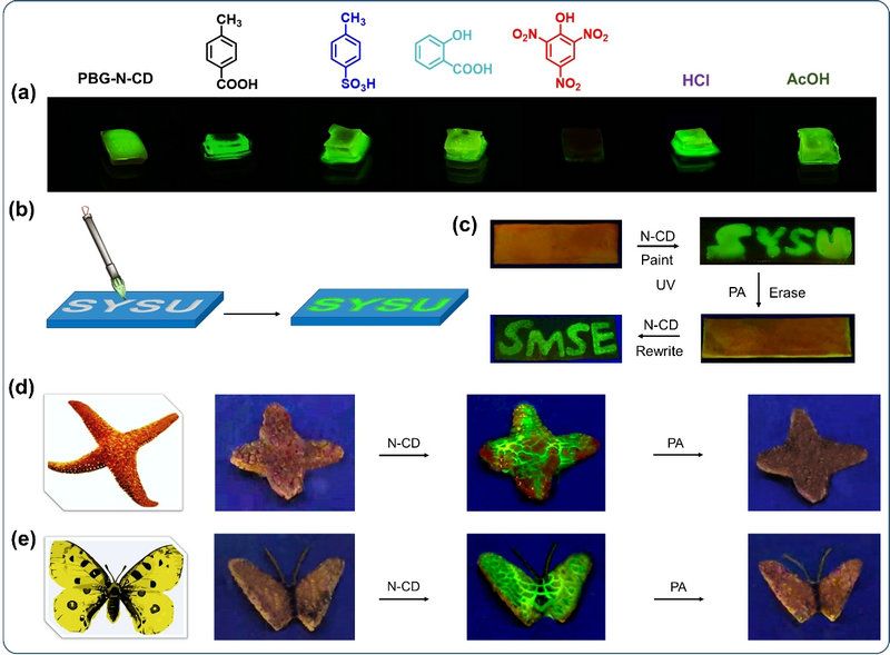 研究發(fā)現,缺電子的三硝基苯酚(PA)共軛環(huán)可特異性地與富電子的萘酰亞胺共軛環(huán)形成π電子供體-受體對,阻斷萘酰亞胺分子之間的π-π作用,使其熒光淬滅。該淬滅作用有很強的選擇性和特異性(圖3a),可特異性地“擦除”或“隱藏”PBG上寫入的N-CD 熒光信息。一方面,在被擦除的PBG表面,可以用蘸有N-CD溶液的毛筆書寫不同的信息(如“SYSU”和“SMSE”,圖3b),這時,聚合物刷表面仍存在自由的Ada基團,捕獲N-CD,固定新的信息,從而實現重復寫入和擦除(圖3c)。另一方面,利用Na2CO3溶液與PA反應,生成水溶性產物,可除去PA,使N-CD熒光恢復,重新解密(恢復)事先寫入的信息。