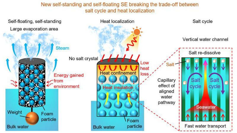 有鑒于此,中山大學材料科學與工程學院翟文濤教授團隊通過連續(xù)定向冷凍鑄造技術制備了一種自站立和自漂浮的3D太陽能驅動蒸發(fā)器。這種新型蒸發(fā)器由有序的水通道和隔熱的泡沫珠粒組成。得益于有序水通道的快速水輸送和泡沫珠粒的隔熱作用,該太陽能驅動蒸發(fā)器實現了在不影響供水的前提下切斷光熱轉換區(qū)的熱量向海水傳遞的熱過程,打破了傳統(tǒng)蒸發(fā)器長期存在的鹽循環(huán)和熱局部化之間的權衡效應。此外,有序輸水通道的毛細作用和泡沫珠粒提供的浮力賦予了自漂浮太陽驅動蒸發(fā)器較大的暴露高度。大的暴露高度有利于增大蒸發(fā)器的界面蒸發(fā)面積并賦予其收集環(huán)境能量的能力,使蒸發(fā)器的solar-to-vapor轉換效率突破100%的理論限制。相比于傳統(tǒng)蒸發(fā)器,所開發(fā)的新型蒸發(fā)器能夠顯著提高海水的蒸發(fā)效率并保障長期脫鹽的穩(wěn)定性。這個研究提出了一種全新的太陽能驅動蒸發(fā)器結構及其構筑方法,也為下一代高效耐鹽蒸發(fā)器的結構設計提供了一種關鍵的見解。