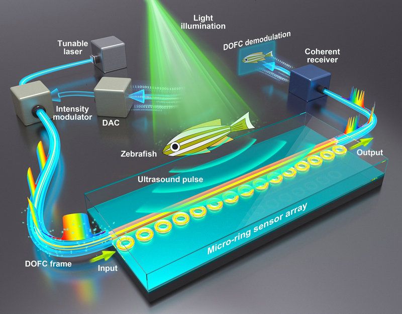 基于上述積累,研究團(tuán)隊(duì)研制出包含15個(gè)微腔的超高靈敏度光學(xué)超聲傳感器陣列,該微環(huán)傳感器陣列具有高靈敏度、大帶寬和小尺寸等優(yōu)點(diǎn),其中單個(gè)微環(huán)傳感器具有175 MHz(-6 dB)的檢測帶寬和2.2?mPaHz?1/2的噪聲等效壓力,性能指標(biāo)達(dá)到國際領(lǐng)先水平?;诳烧{(diào)的數(shù)字光頻梳技術(shù),該研究團(tuán)隊(duì)還研發(fā)了一套可與微環(huán)傳感器陣列相匹配的高性能并行信號檢測方案,對高速動(dòng)態(tài)粒子、靜態(tài)葉脈和活體斑馬魚等展示了光聲計(jì)算成像結(jié)果。