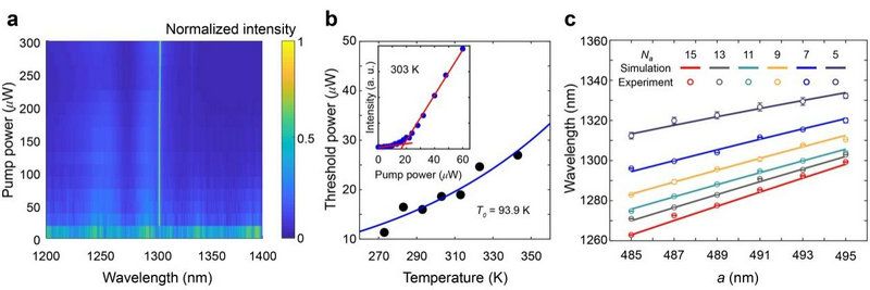 研究組采用微加工工藝制備上述微納結(jié)構(gòu),采用薄膜轉(zhuǎn)移技術(shù)將其轉(zhuǎn)移到玻璃襯底上,最后以紫外固化膠作粘結(jié)劑在其上方再覆蓋一層玻璃,形成Mini-BIC所需的在垂直方向?qū)ΨQ的平板三明治結(jié)構(gòu),最終成功制作出最小微腔尺寸約為2.5×2.5 μm2,模式體積約為1.16(λ/n)3的室溫連續(xù)光泵浦單模Mini-BIC激光器(圖2a)。該激光器的閾值功率僅17 μW,而且其閾值功率密度只是已報(bào)道的具有最佳特性的半導(dǎo)體BIC激光器的1/236。同時(shí),器件最高工作溫度可達(dá)343 K (70 ℃),擬合特征溫度高達(dá)93.9 K(圖2b)。通過改變光子晶體周期與尺寸,還能夠?qū)崿F(xiàn)約80 nm范圍的激射波長調(diào)諧(圖2c)。