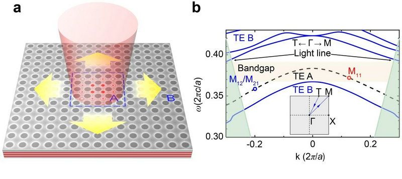 圖1 小型化連續(xù)域束縛態(tài)(mini-BICs)激光器的原理。(a) Mini-BICs激光器的示意圖;(b) 平板光子晶體的能帶圖:處于光線(Light Line)以上輻射域中有限光子晶體A的能態(tài),位于區(qū)域B的帶隙中。