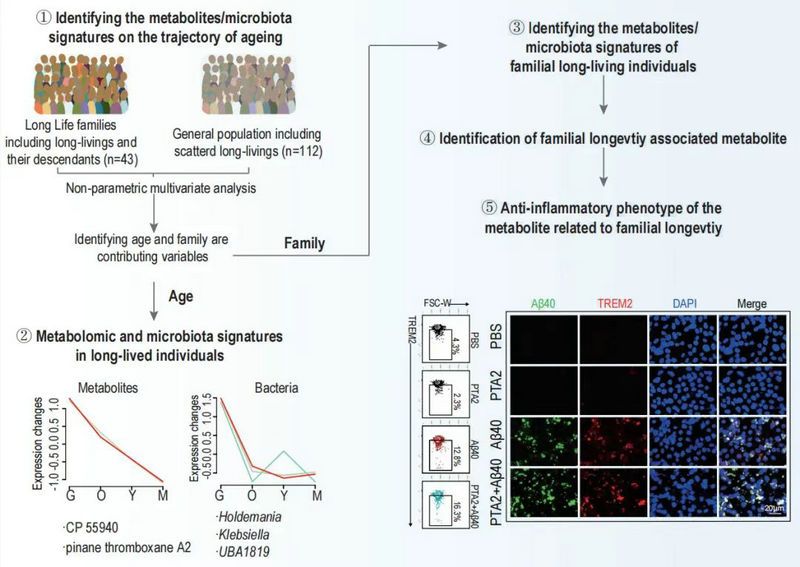 研究發(fā)現(xiàn)長(zhǎng)壽家族隊(duì)列的長(zhǎng)壽個(gè)體擁有不同于普通人群長(zhǎng)壽個(gè)體的微生物組和代謝組特征,并進(jìn)一步發(fā)現(xiàn)與衰老呈正或負(fù)相關(guān)的系列代謝物,其中正相關(guān)代謝物蒎烷血栓素 A2 (PTA2) 的水平在長(zhǎng)壽家族個(gè)體及其年輕后代中始終高于普通人群,并與年齡正相關(guān);互作網(wǎng)絡(luò)分析結(jié)果表明這些與衰老正相關(guān)的代謝產(chǎn)物與腸道瘤胃菌科(Ruminococcaceae), Intestinimonas, Alistipes, 乳球菌(Lactococcus)等的相對(duì)豐度緊密相關(guān)。進(jìn)一步的功能分析顯示 PTA2 通過(guò)激活STAT6信號(hào)途徑上調(diào)小膠質(zhì)細(xì)胞中TREM2的表達(dá),增強(qiáng)了小膠質(zhì)細(xì)胞吞噬具有神經(jīng)毒性作用的β-淀粉樣蛋白40(Aβ40)的效率并提高了抗炎表型,表明 PTA2 對(duì)宿主健康具有保護(hù)作用。為進(jìn)一步證實(shí)在生理濃度下PTA2的這一作用,合作團(tuán)隊(duì)用基于液相色譜串聯(lián)質(zhì)譜法(LC-MS/MS)定量測(cè)定了健康人群和與老齡相關(guān)的腦小血管病人(ASVD)血清樣本中PTA2的濃度,發(fā)現(xiàn)病人的PTA2濃度顯著低于健康人群。綜上,本研究證實(shí)腸道微生物組及其代謝產(chǎn)物在健康老化中的作用,提示PTA2可以作為健康老化潛在的干預(yù)靶點(diǎn)之一。