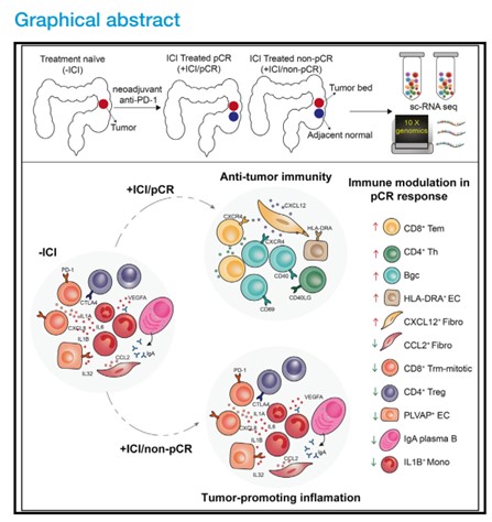 這項(xiàng)研究中,鄧艷紅教授團(tuán)隊(duì)基于前瞻性臨床試驗(yàn)PICC研究(Lancet Gastroenterol Hepatol. 2022,7(1):38-48)的單細(xì)胞轉(zhuǎn)錄組測(cè)序數(shù)據(jù),建立了關(guān)于PD-1單抗免疫治療錯(cuò)配修復(fù)蛋白缺陷或微衛(wèi)星不穩(wěn)定型(dMMR/MSI-H)腸癌腫瘤微環(huán)境改變的動(dòng)態(tài)圖譜,闡釋了PD-1單抗治療dMMR/MSI-H結(jié)直腸癌的細(xì)胞分子機(jī)制,并揭示了dMMR/MSI-H腸癌對(duì)PD-1治療耐藥的潛在機(jī)制是IL-1B主導(dǎo)的炎性環(huán)境及Tregs殘留,為dMMR/MSI-H結(jié)直腸癌提供了新的免疫治療靶點(diǎn)。