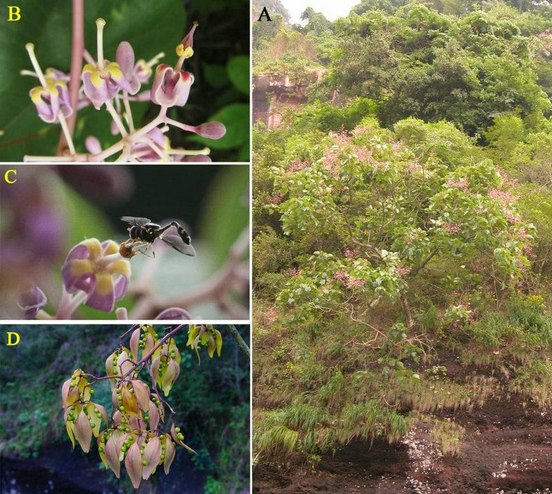 近日,該研究以“The origin and dispersal of Firmiana danxiaensis among isolated specific landscapes”為題在學術期刊Journal of Systematics and Evolution上在線發(fā)表。中山大學是本文的第一作者單位,中山大學生命科學學院凡強副教授及中山大學地球科學與工程學院黃康有副教授為論文共同通訊作者。該研究工作是在周婷副教授主持的“國家公園建設專項”(丹霞山生物多樣性科考專項)資助下完成的,廣東丹霞山國家級自然保護區(qū)、韶關學院、廣東石門臺國家級自然保護區(qū)也參與了本項研究。