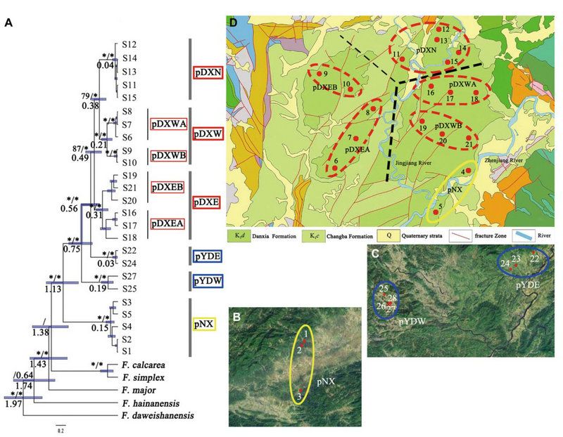2020年開始,廖文波教授、凡強副教授課題組對丹霞山、南雄盆地及英德喀斯特地區(qū)進行了廣泛的采樣,共計28群體295個體,結合傳統(tǒng)Sanger測序及二代測序手段對其進行了深入分析:選取其中25個代表性個體進行淺層基因組測序,提取其葉綠體基因組構建系統(tǒng)發(fā)育樹推測種子擴散路線及居群分歧時間,基于4個高變葉綠體位點及簡化基因組測序技術對28居群進行群體測序以探測居群結構及分化。