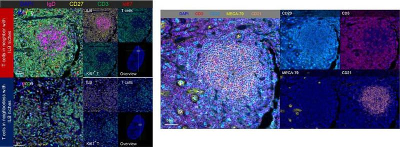 鼻咽癌患者腫瘤組織切片多色免疫熒光染色顯示ILB與Ki67+ proliferating T細(xì)胞聚集,并定位于化療誘導(dǎo)的“類”三級淋巴樣結(jié)構(gòu)中